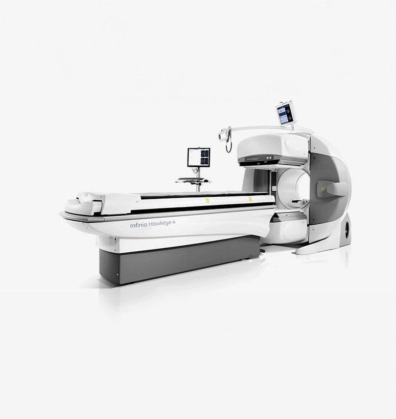 Die Infinia Hawkeye ist eine Hybrid-Gamma-Kamera (SPECT/CT), sie setzt sich aus einer normalen nuklearmedizinischen Gamma-Kamera (SPECT) und einer Ultra-Niedrig-CT-Kamera zusammen. Aus beiden Aufnahmeverfahren entstehen Fusions-/Hybridbilder.